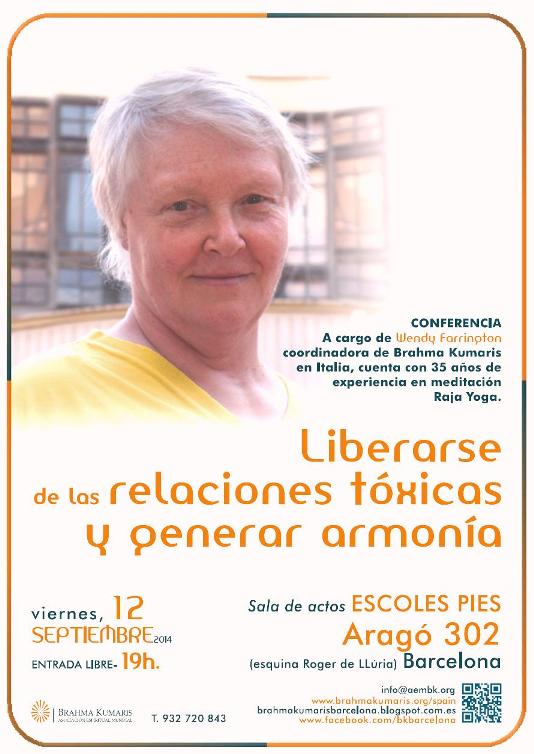 El pasado viernes 12 de septiembre, en la Sala de actos de Escoles Pies, la coordinadora de Brahma Kumaris en Italia, Wendy Farrington impartió una conferencia titulada: “Liberarse de las relaciones tóxicas y generar armonía”.