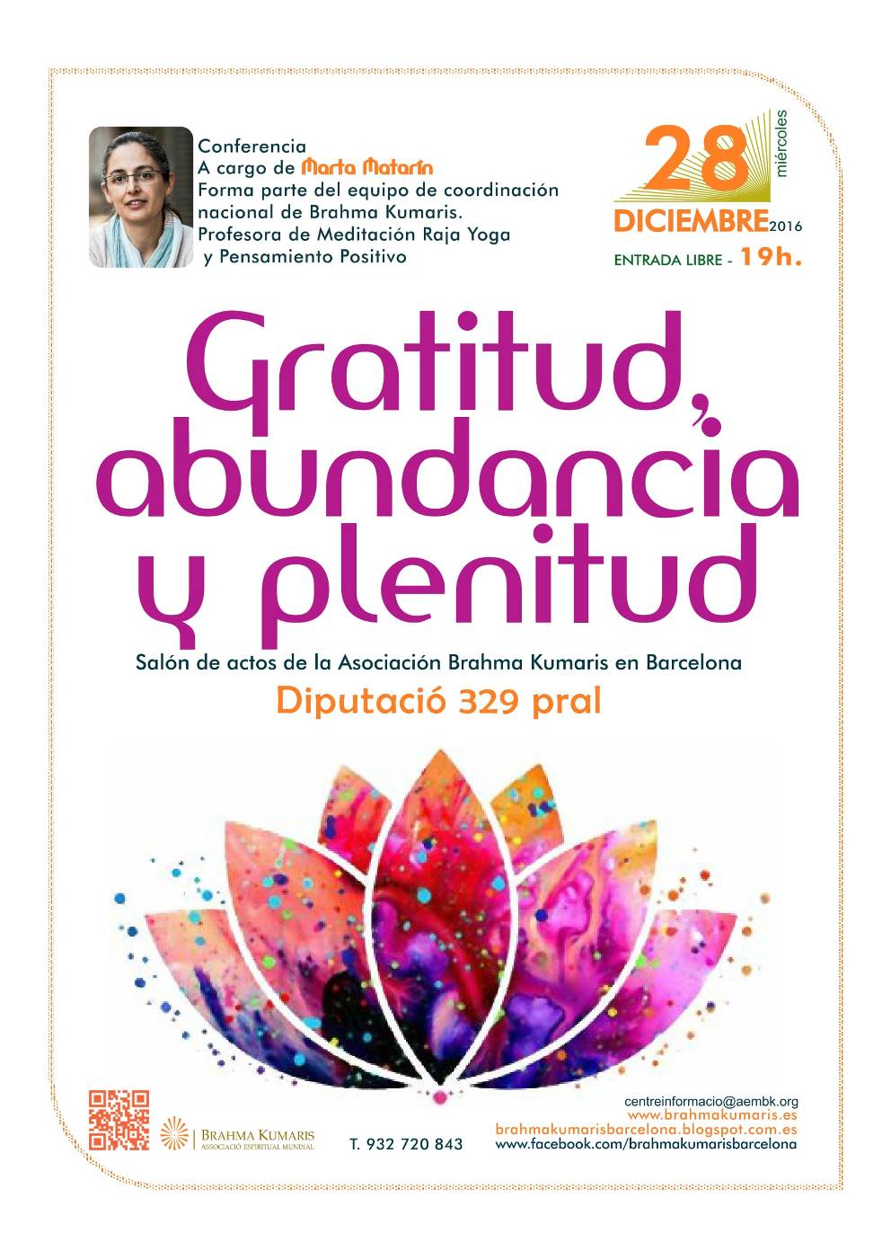 Conferencia Marta Matarín el miércoles 28/12/2016 a las 19 h.: Gratitud, abundancia y plenitud (ESP).