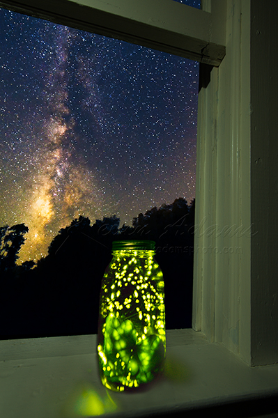 Fireflies or lightning bugs (Photinus pyralis) light up a jar sitting on a window sill, while the Milky Way lights up the sky in the background. Photographed on a June evening in North Carolina.
