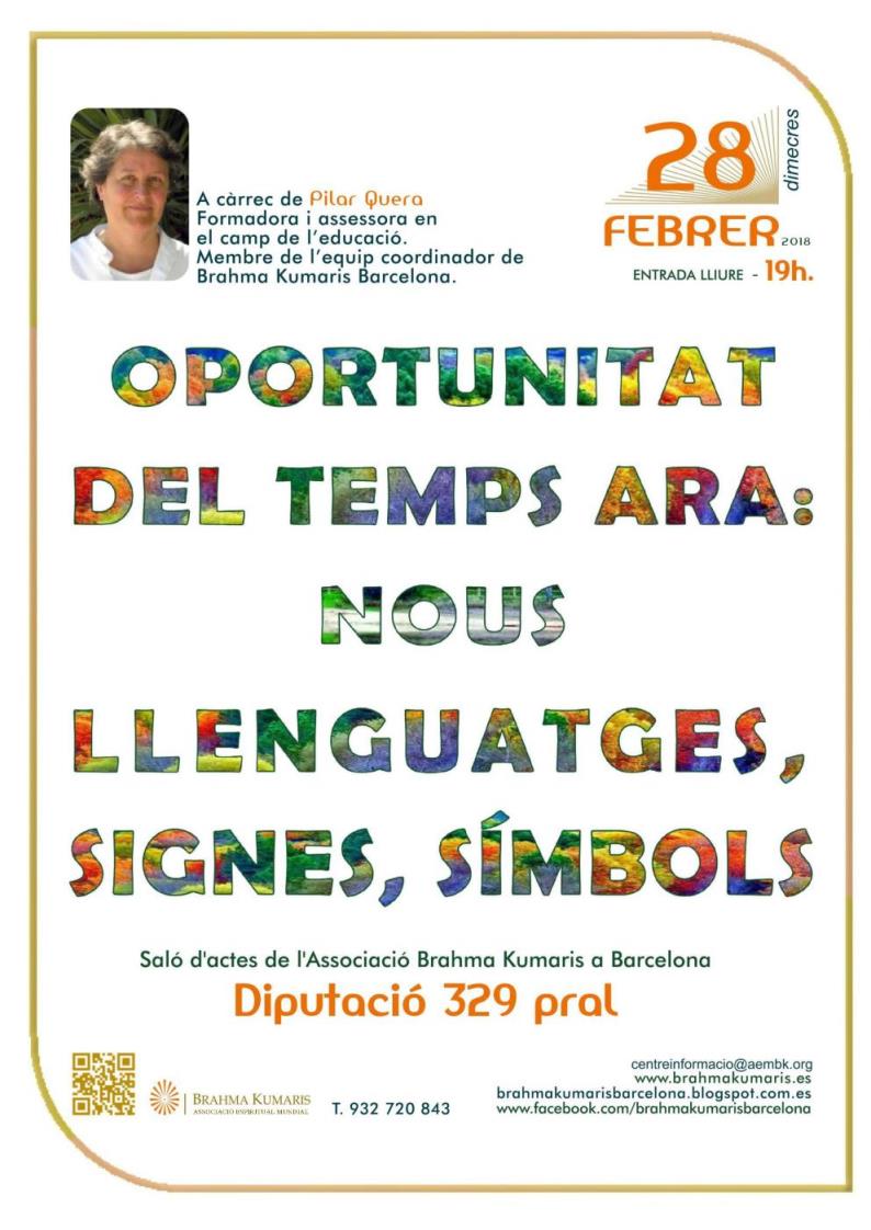 Us informem de la propera conferència que donarà la Pilar Quera el dimecres 28 de febrer a les 19h. amb el títol “oportunitat del temps ara: nous llenguatges, signes, símbols“. Tindrà lloc a la seu de Brahma Kumaris (Diputació, 329 pral. Barcelona).