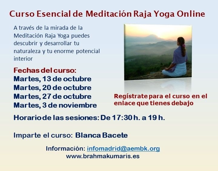 Brahma Kumaris Barcelona: CURSO ESENCIAL DE MEDITACIÓN RAJA YOGA ONLINE, MARTES 13 DE OCTUBRE, CON BLANCA BACETE