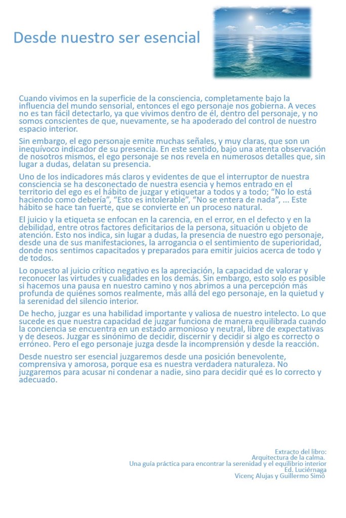 Des del nostre ser essencial jutjarem des d’una posició benvolent, comprensiva i amorosa, perquè aquesta és la nostra veritable naturalesa. No jutjarem per acusar ni condemnar ningú, sinó per decidir què és el correcte i adequat.