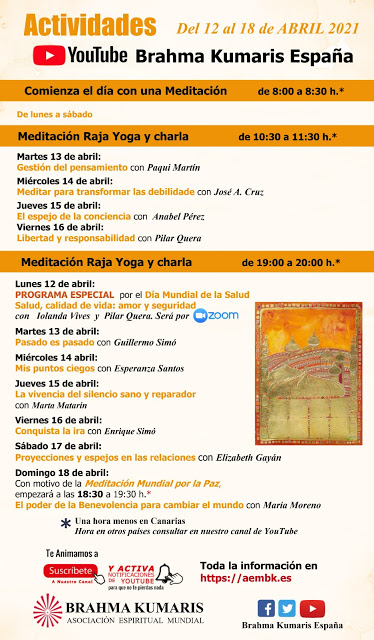 “Meditaciones Raja Yoga con charla” desde el Canal de YouTube Brahma Kumaris España. Del 12 al 18 de abril 2021