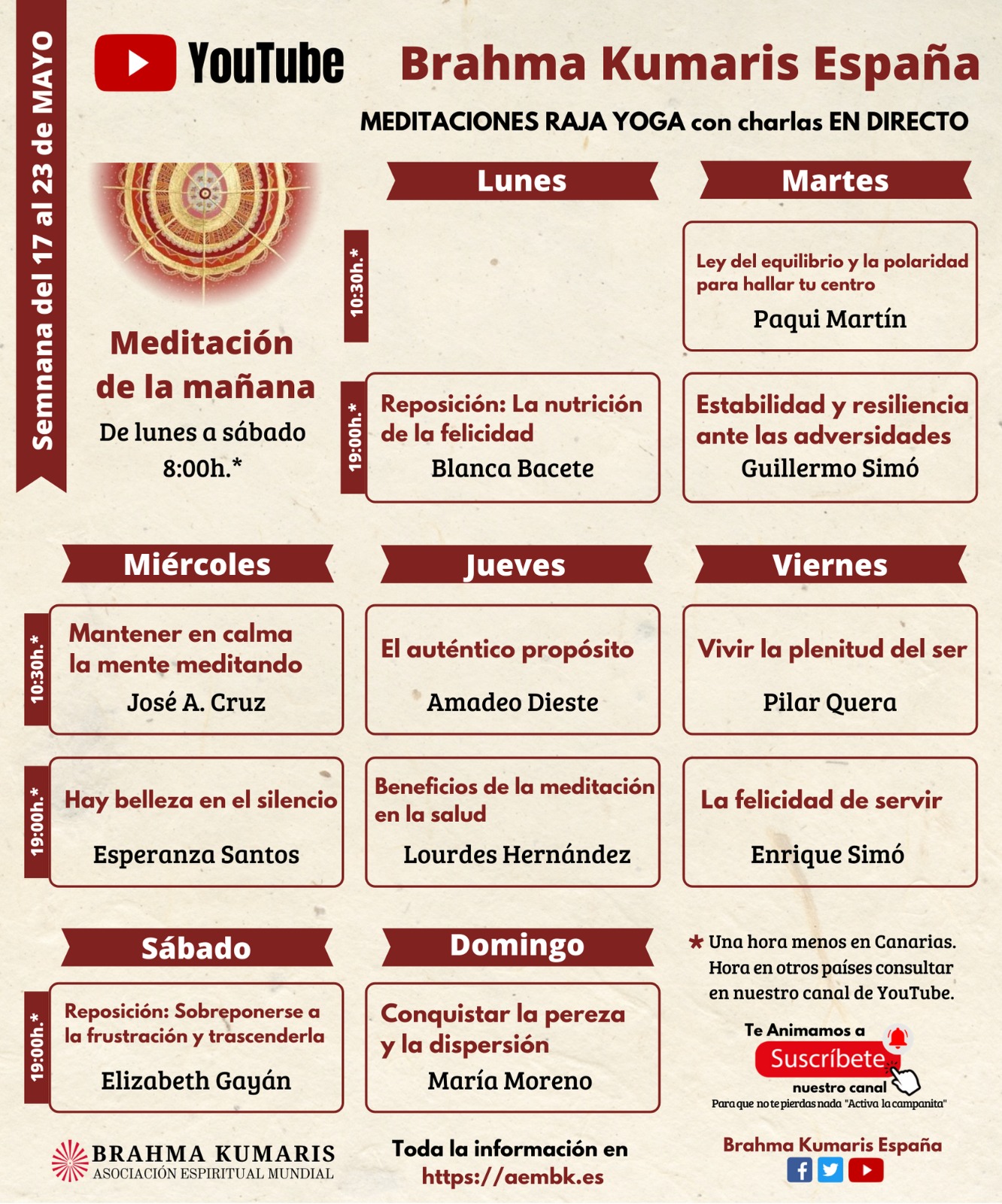 Os invitamos a nuestras “Meditaciones Raja Yoga con charla” desde el Canal de YouTube Brahma Kumaris España.