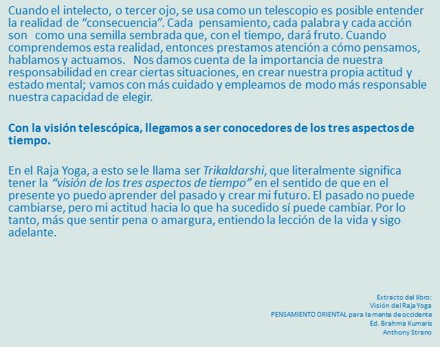 Lo mismo ocurre cuando llegamos a comprender que para el alma, lo que soy realmente, quien de verdad contempla la vista de pájaro detrás del ojo, el ojo del ojo, el tiempo no existe; que el pasado, el presente y el futuro es la vista de pájaro del alma con respecto al desarrollo de la vida en este mundo. PUNTOS 12/7/19: *Los tres aspectos del tiempo nos dan la pauta: ¿Qué era ayer? ¿Qué soy hoy? Qué seré mañana?* Si entiendo que el presente es el resultado del pasado, también entiendo que el futuro lo construyo en el presente. Este es el estado trikaldarshi. Este es el estado de máxima comprensión. Para el que está detrás del ojo que contempla la escena en conjunto, el tiempo sólo existe para el cuerpo, para la materia, en absoluto no para la luz de la que está formado él mismo, el ser de luz.