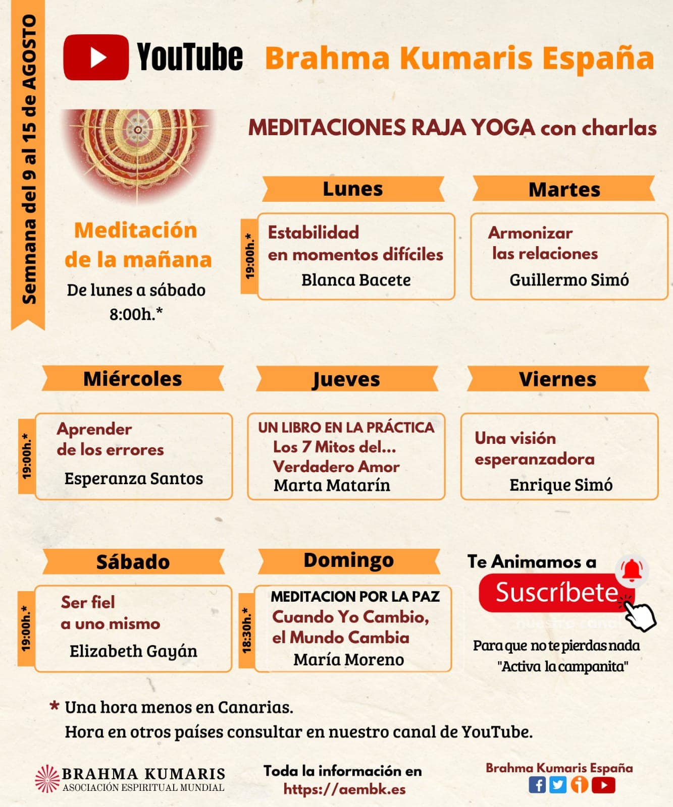 *Una hora menos en Canarias.Hora en otros países consultar en nuestro canal de YouTube. Os animamos a que lo divulguéis entre vuestros contactos y amistades.