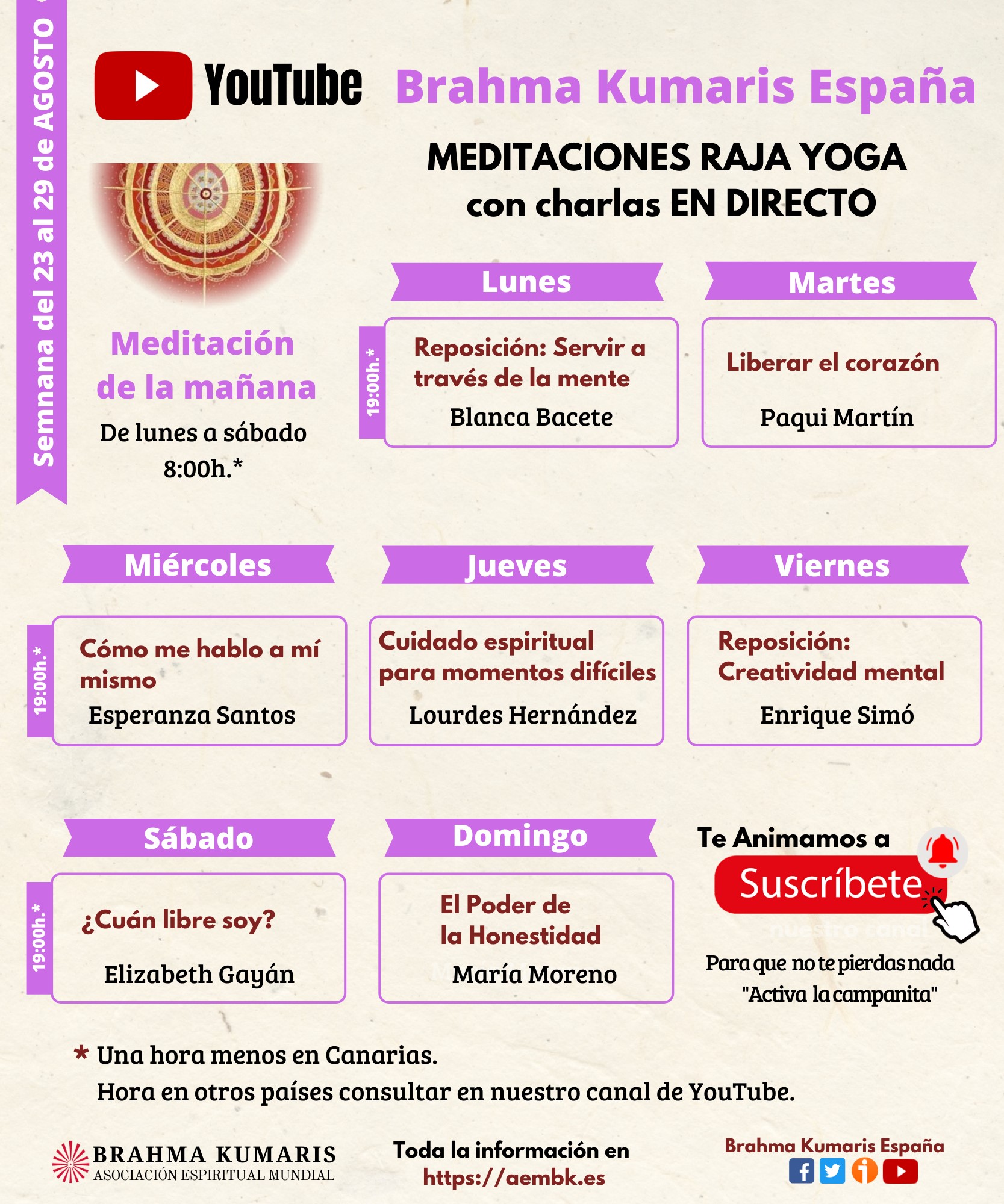 Estimados/as amigos/as:Os invitamos a nuestras “Meditaciones Raja Yoga con charla” desde el Canal de YouTube Brahma Kumaris España. Suscríbete y Activa la Campanita para que no te pierdas nada https://www.youtube.com/BrahmaKumarisEspaña Toda la información de nuestras actividades en https://aembk.es/
