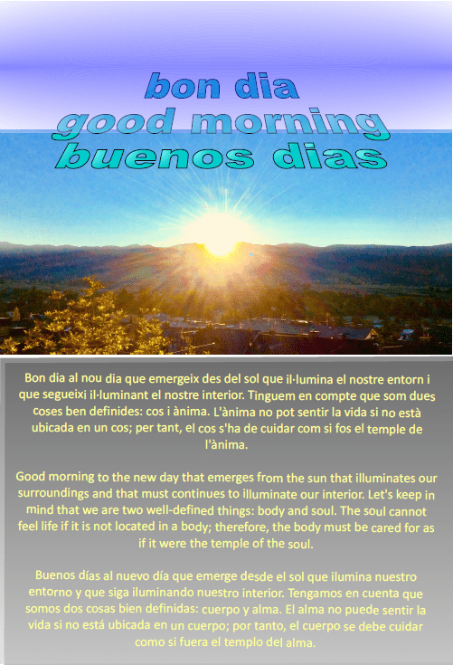 🌞Bon dia al nou dia que emergeix des del sol que il·lumina el nostre entorn i que segueixi il·luminant el nostre interior. Tinguem en compte que som dues coses ben definides: cos i ànima. L’ànima no pot sentir la vida si no està ubicada en un cos; per tant, el cos s’ha de cuidar com si fos el temple de l’ànima.