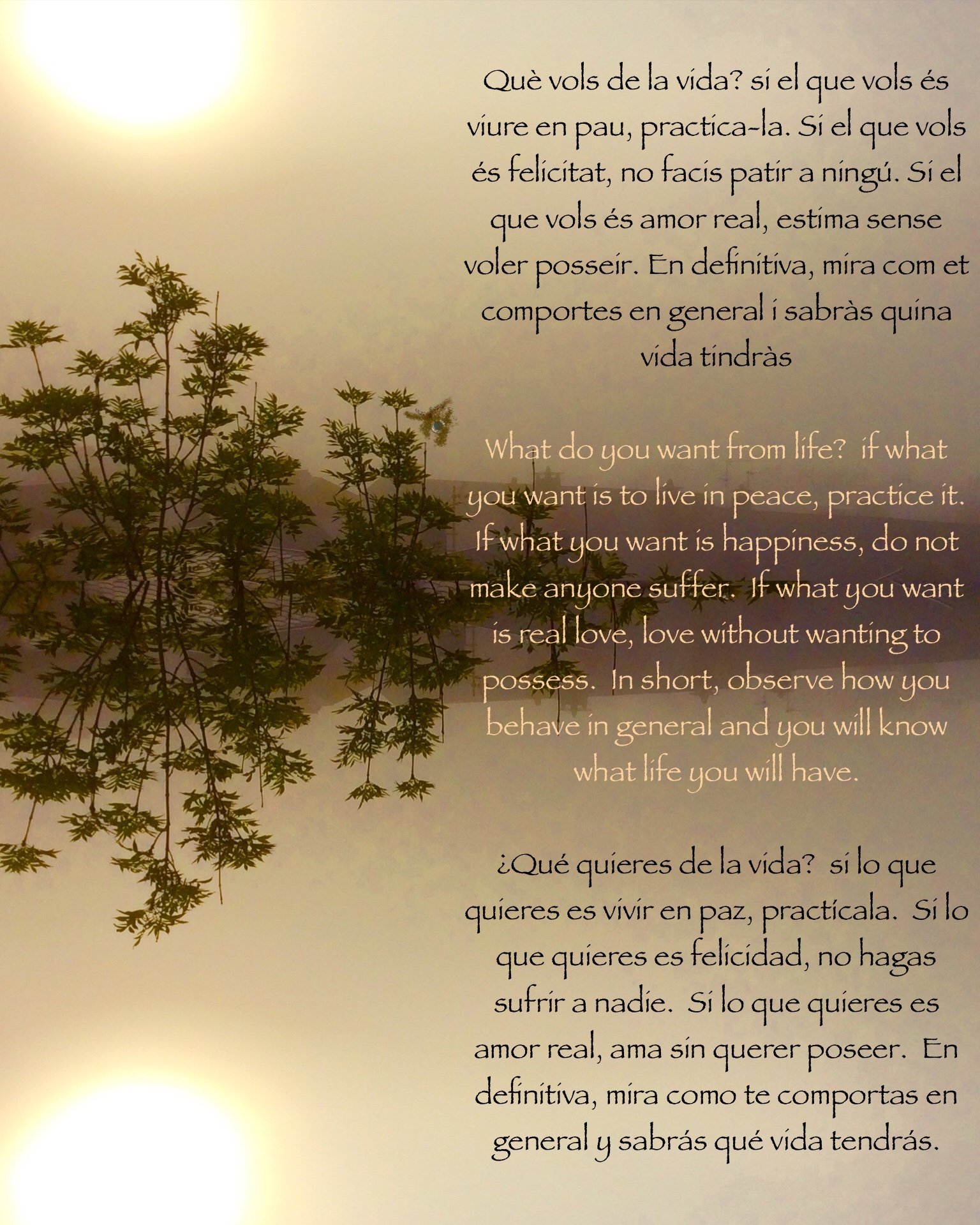 Què vols de la vida? si el que vols és viure en pau, practica-la. Si el que vols és felicitat, no facis patir a ningú. Si el que vols és amor real, estima sense voler posseir. En definitiva, mira com et comportes en general i sabràs quina vida tindràs.