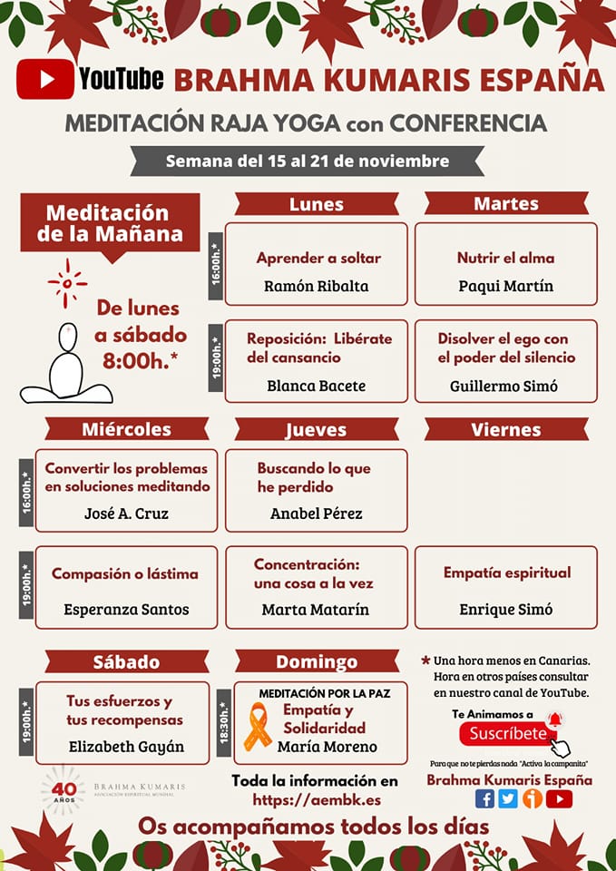 *Domingo 21 de noviembre*18:30 a 19:30 h.*Meditación mundial por la Paz del 3º domingo:“Empatía y Solidaridad”Dedicada al “Día Mundial del recuerdo de las víctimas de accidentes de tráfico”con María Moreno