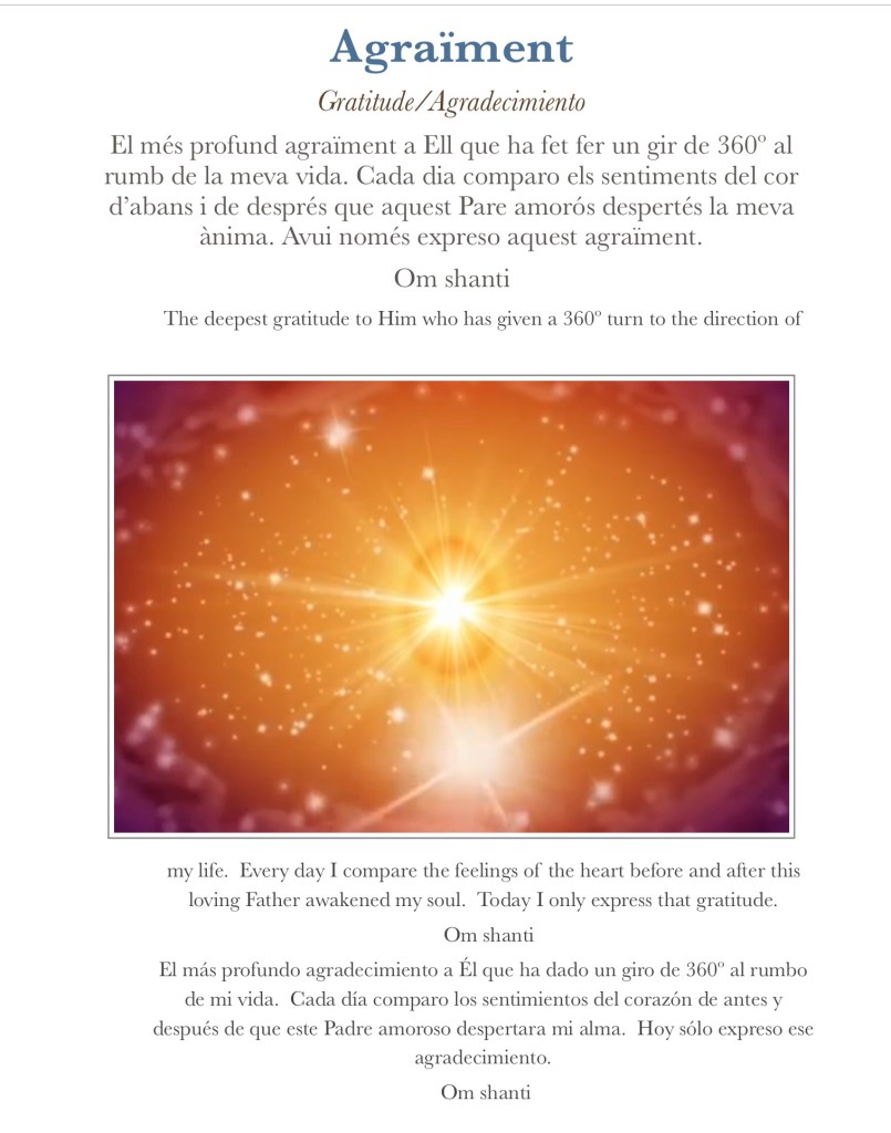 El més profund agraïment a Ell que ha fet fer un gir de 360º al rumb de la meva vida. Cada dia comparo els sentiments del cor d’abans i de després que aquest Pare amorós despertés la meva ànima. Avui només expreso aquest agraïment.