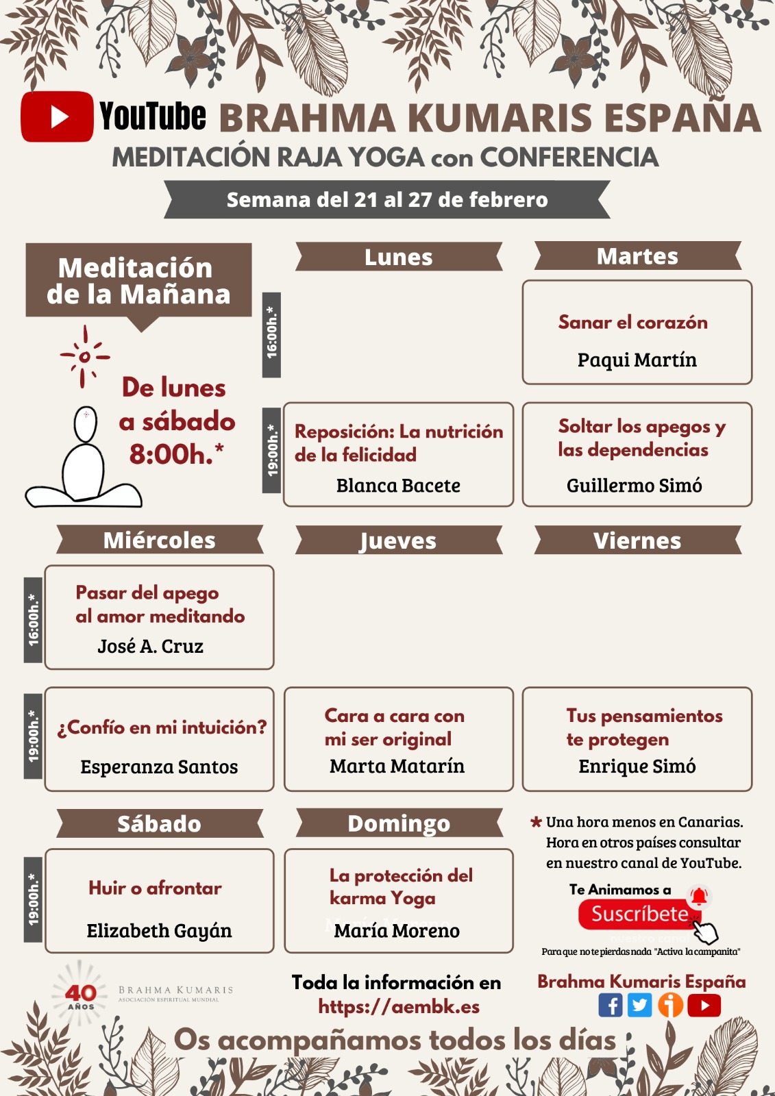 Os invitamos a nuestras “Meditaciones Raja Yoga con conferencia” desde el Canal de YouTube Brahma Kumaris España. Suscríbete y Activa la Campanita para que no te pierdas nada https://www.youtube.com/BrahmaKumarisEspaña Os acompañamos todos los días.