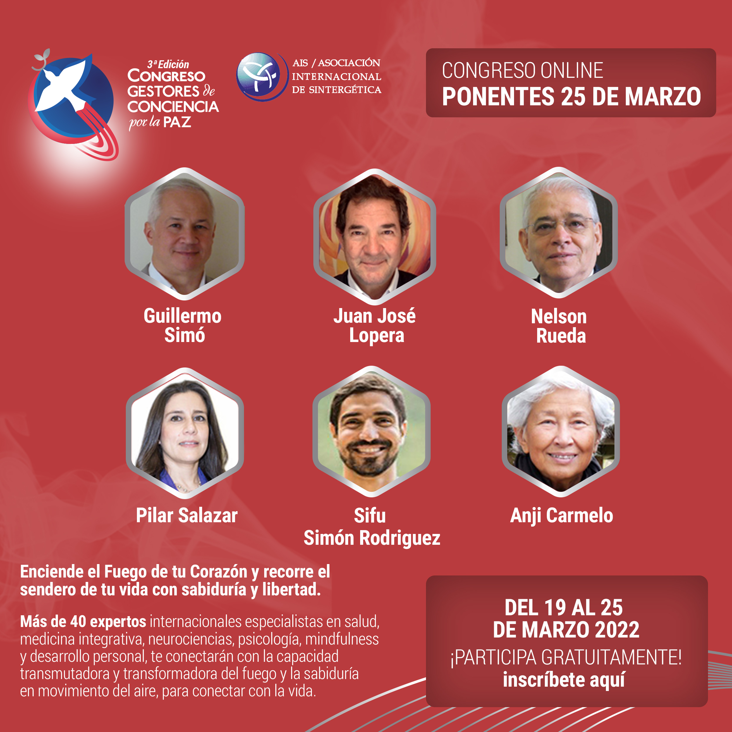 La Asociación Brahma Kumaris participa en el tercer Congreso Online Internacional “Gestores de Conciencia por la Paz” entre el 19 y 25 de marzo 2022. Más de 40 expertos internacionales especialistas en salud, medicina integrativa, neurociencias, psicología, mindfulness y desarrollo personal, te conectarán con la capacidad transmutadora y transformadora del fuego y la sabiduría en movimiento del aire, para conectar con la vida.