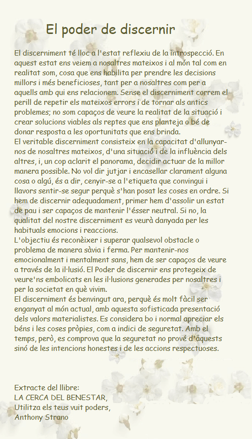 L’objectiu és reconèixer i superar qualsevol obstacle o problema de manera sàvia i ferma. Per mantenir-nos emocionalment i mentalment sans, hem de ser capaços de veure a través de la il·lusió. El Poder de discernir ens protegeix de veure’ns embolicats en les il·lusions generades per nosaltres i per la societat en què vivim.