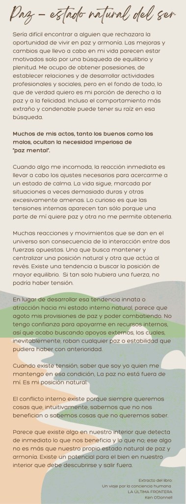 Cuando existe tensión, sé que soy yo quien me mantengo en esa condición. La paz no está fuera de mí. Esa es mi posición natural.