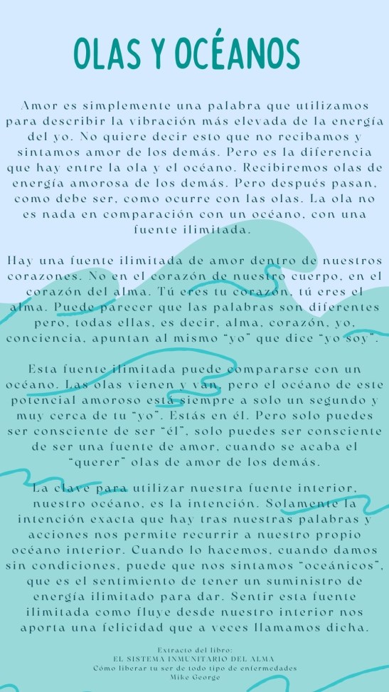 Esta fuente ilimitada puede compararse con un océano. Las olas vienen y van, pero el océano de este potencial amoroso está siempre a solo un segundo y muy cerca de tu “yo”. Estás en él, solo puedes ser consciente de ser una fuente de amor, cuando se acaba el “querer” olas de amor de los demás.