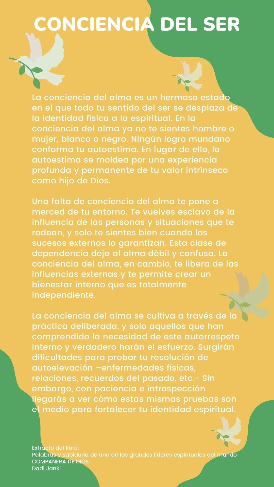 La consciència de l’ànima és un bell estat on tot el teu sentit de l’ésser es desplaça de la identitat física a l’espiritual. A la consciència de l’ànima ja no et sents home o dona, blanc o negre. Cap èxit mundà conforma la teva autoestima. En lloc d’això, l’autoestima es modela per una experiència profunda i permanent del teu valor intrínsec com a fill de Déu.