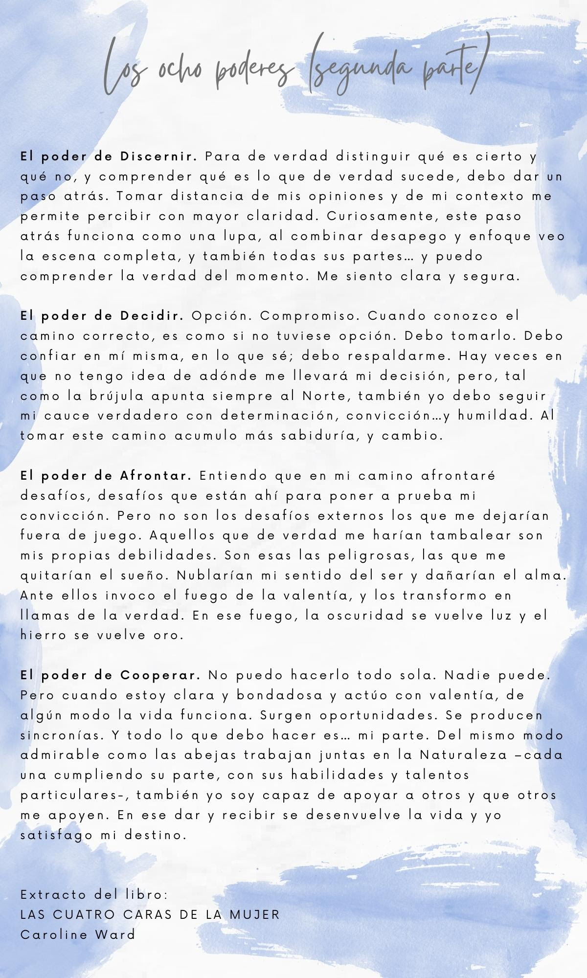 El poder de Cooperar. No ho puc fer tot sola. Ningú no pot. Però quan estic clara i bondadosa i actuo amb valentia, la vida funciona d’alguna manera. Sorgeixen oportunitats. Es produeixen sincronies. I tot el que he de fer és… la meva part. De la mateixa manera admirable com les abelles treballen juntes a la Natura -cadascuna complint la seva part, amb les seves habilitats i talents particulars-, també jo sóc capaç de donar suport als altres i que altres em donin suport. En aquest donar i rebre es desenvolupa la vida i jo satisfaig el meu destí.
