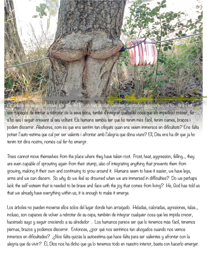 Els arbres no es poden moure ells sols del lloc on han arrelat. Gelades, calorades, agressions, tal.les.., fins i tot, son capaços de tornar a rebrotar de la seva soca, també d’integrar qualsevol cosa que els impedeixi créixer, fer-s’ho seu i seguir creixent al seu voltant. Els humans sembla ser que ho tenim més fàcil, tenim cames, braços i podem discernir. Aleshores, com és que ens sentim tan ofegats quan ens veiem immersos en dificultats? Ens falta potser l’auto-estima que cal per ser valents i afrontar amb l’alegria que dóna viure? Ell, Déu ens ha dit que ja ho tenim tot dins nostre, només cal fer-ho emergir.