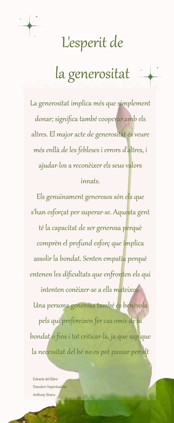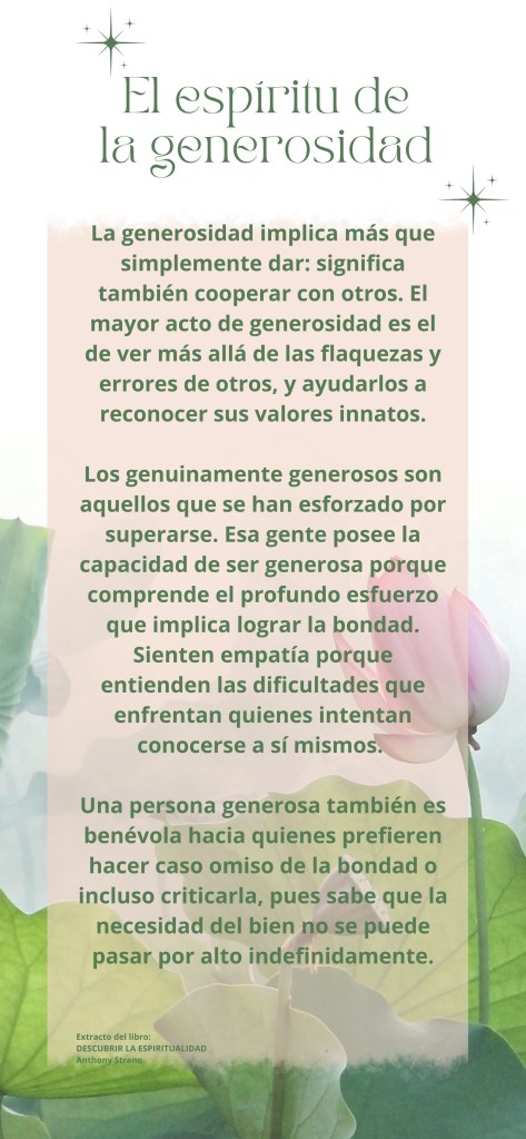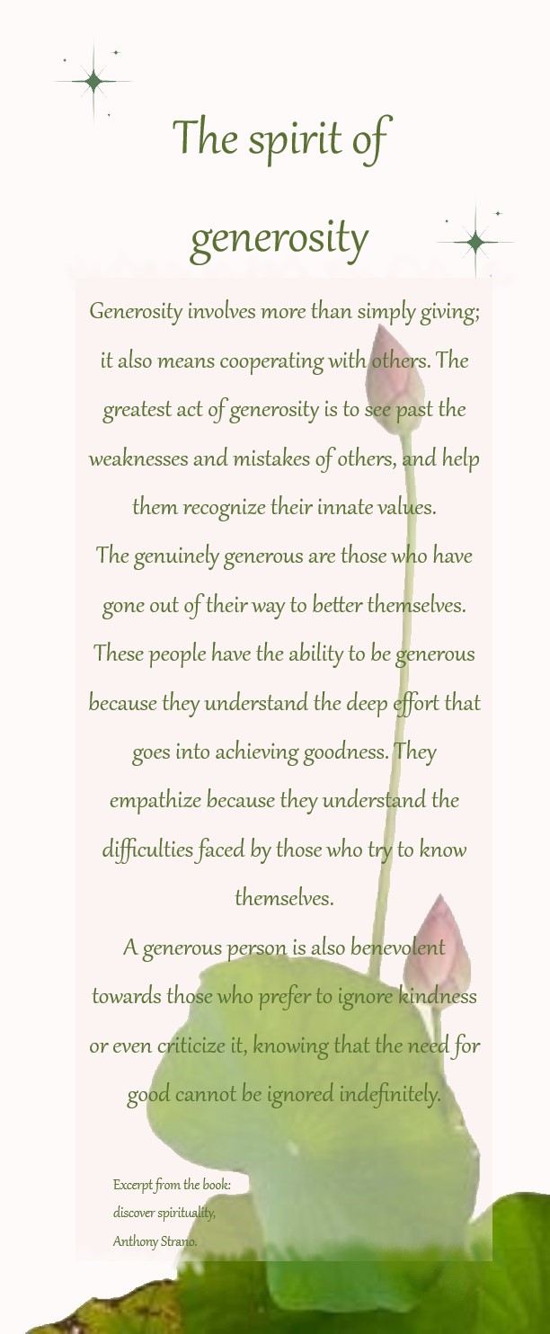 Els genuïnament generosos són els que s’han esforçat per superar-se. Aquesta gent té la capacitat de ser generosa perquè comprèn el profund esforç que implica assolir la bondat. Senten empatia perquè entenen les dificultats que enfronten els qui intenten conèixer-se a ells mateixos.