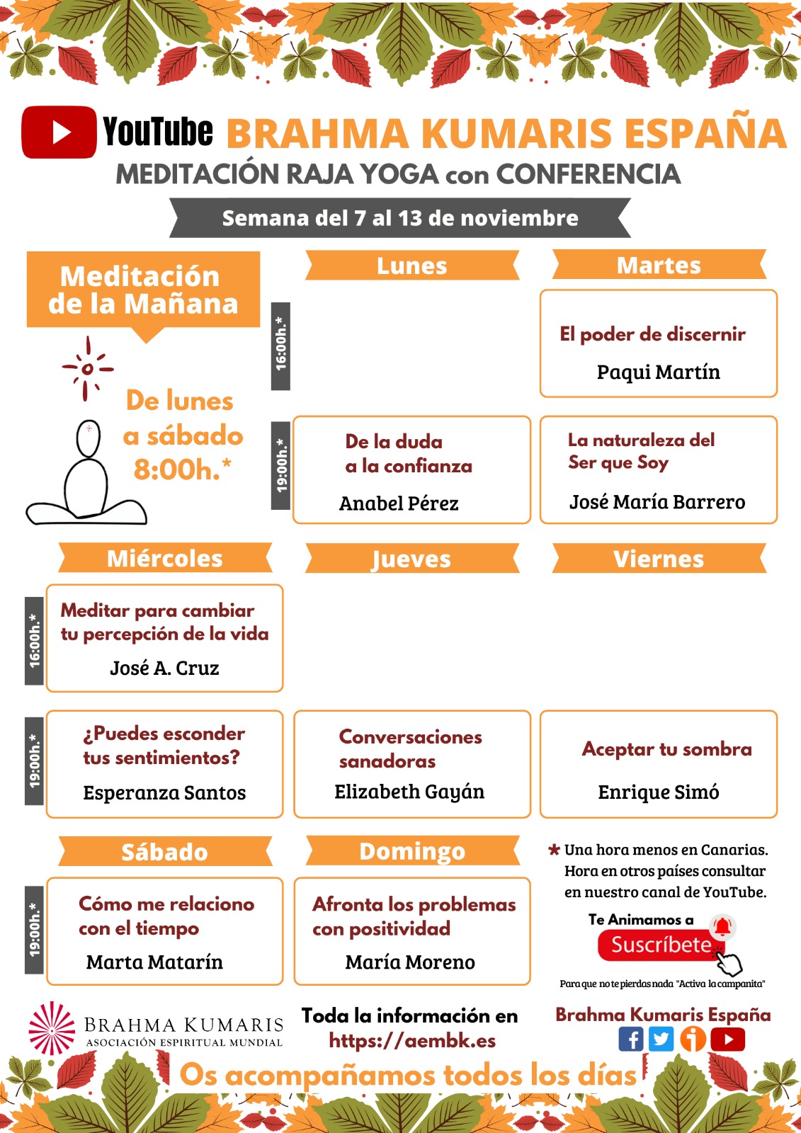 Os invitamos a nuestras “Meditaciones Raja Yoga con conferencia” desde el Canal de YouTube Brahma Kumaris España. Suscríbete y Activa la Campanita para que no te pierdas nada https://www.youtube.com/BrahmaKumarisEspaña Os acompañamos todos los días.