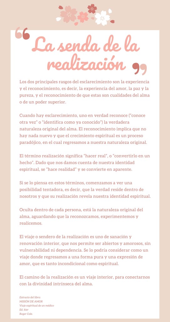 El viaje o sendero de la realización es uno de sanación y renovación interior, que nos permite ser abiertos y amorosos, sin vulnerabilidad ni dependencia. Se lo podría considerar como un viaje donde regresamos a una forma pura y una expresión de amor, que es tanto incondicional como espiritual.