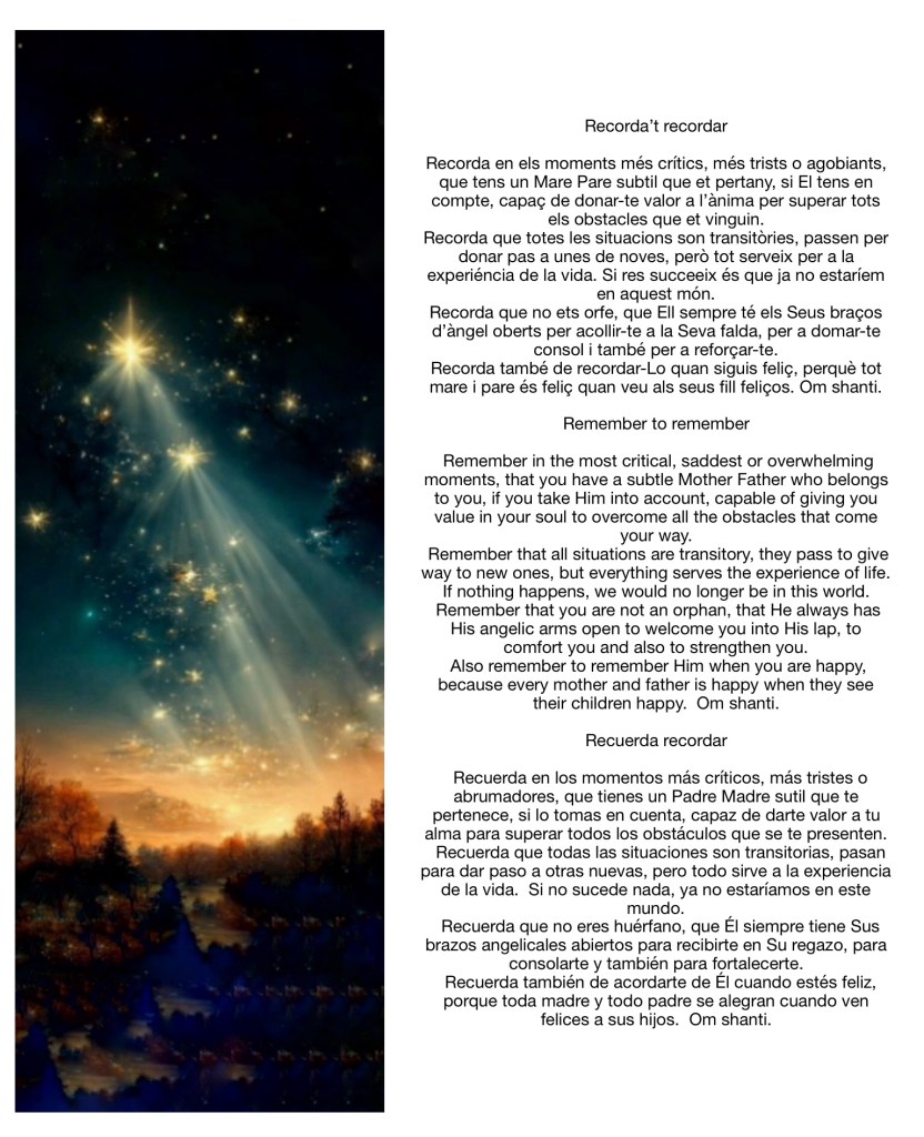 Recorda també de recordar-Lo quan siguis feliç, perquè tot mare i pare és feliç quan veu als seus fills feliços. Om shanti.