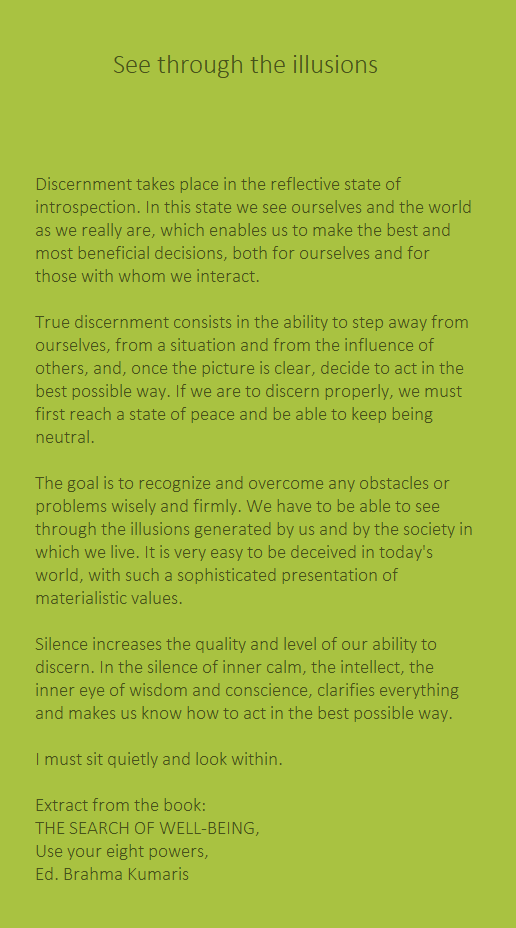 Discernment takes place in the reflective state of introspection. In this state we see ourselves and the world as we really are, which enables us to make the best and most beneficial decisions, both for ourselves and for those with whom we interact.