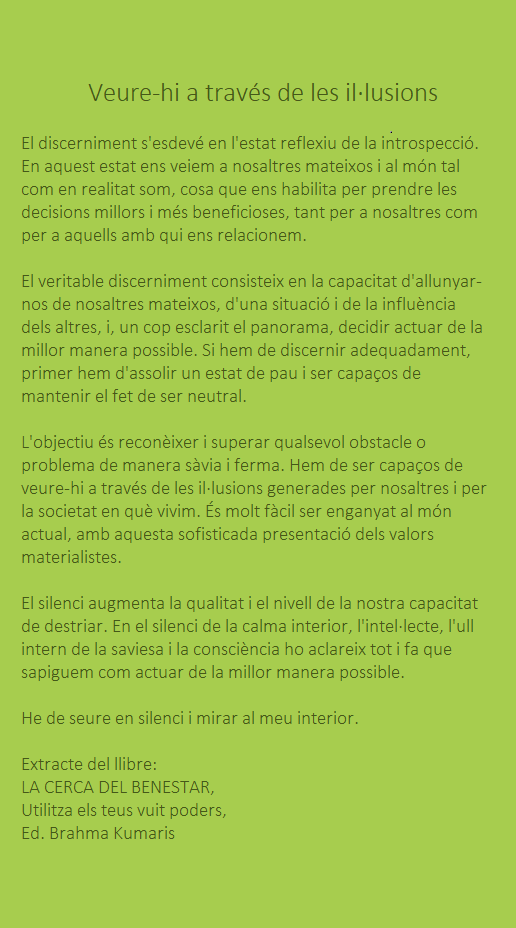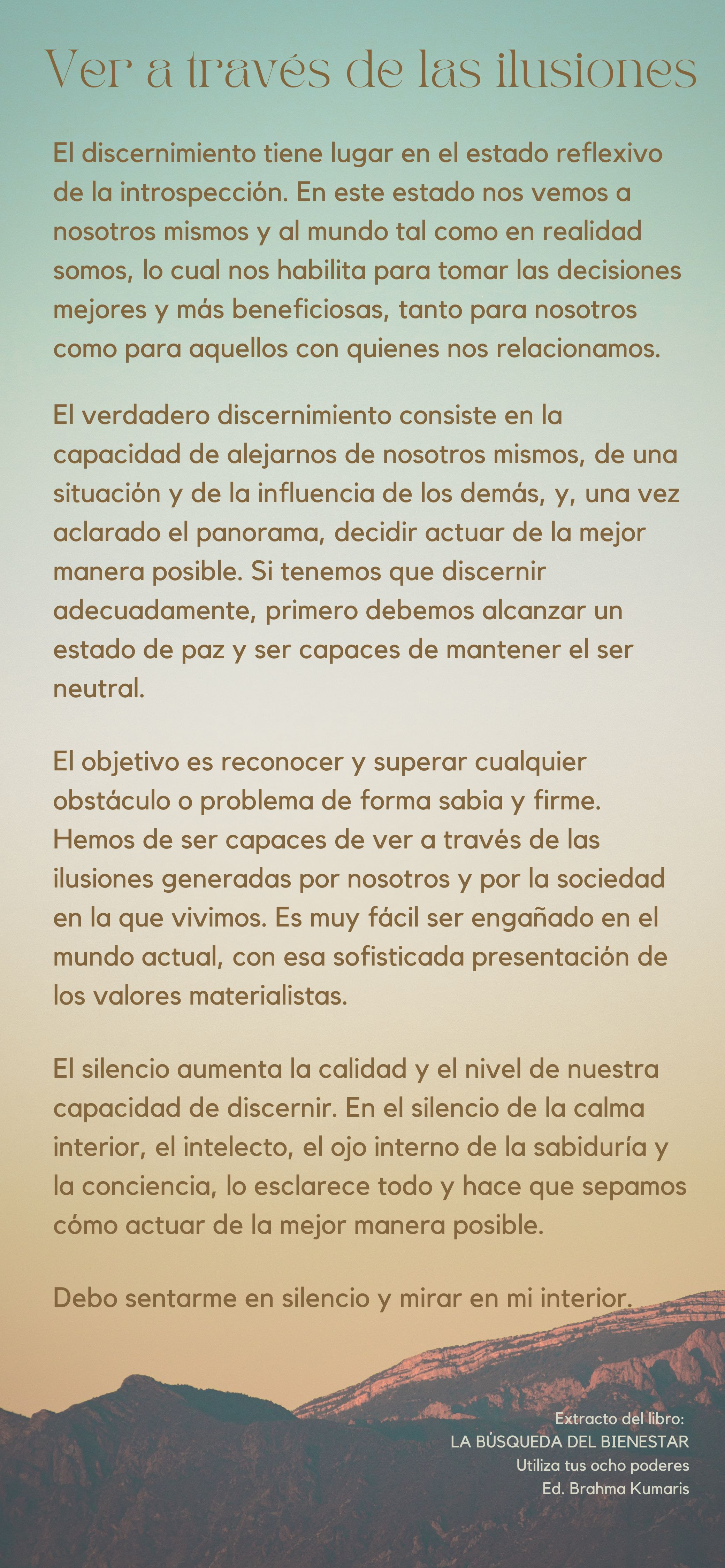 El discernimiento tiene lugar en el estado reflexivo de la introspección. En este estado nos vemos a nosotros mismos y al mundo tal como en realidad somos, lo cual nos habilita para tomar las decisiones mejores y más beneficiosas, tanto para nosotros como para aquellos con quienes nos relacionamos.