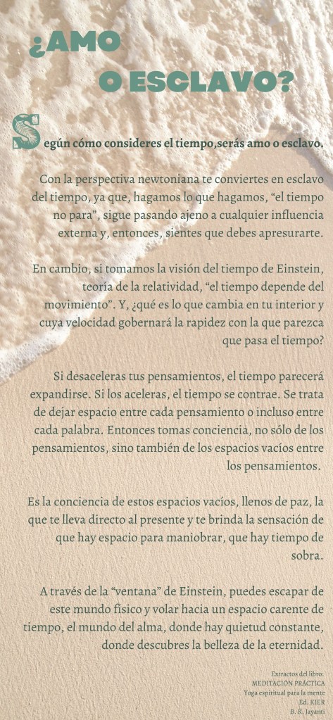Con la perspectiva newtoniana te conviertes en esclavo del tiempo, ya que, hagamos lo que hagamos, “el tiempo no para”, sigue pasando ajeno a cualquier influencia externa y, entonces, sientes que debes apresurarte.
