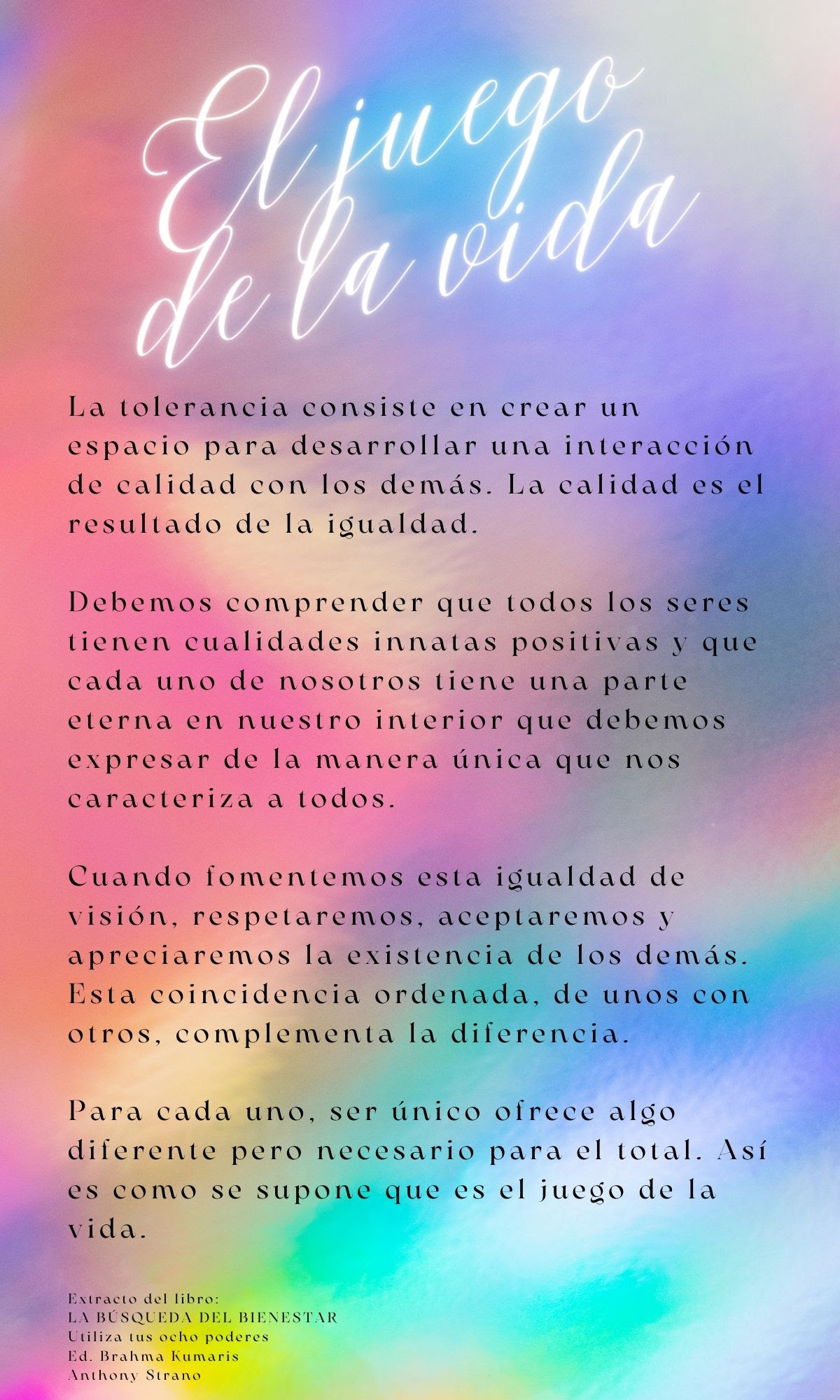 La tolerancia consiste en crear un espacio para desarrollar una interacción de calidad con los demás. La calidad es el resultado de la igualdad.