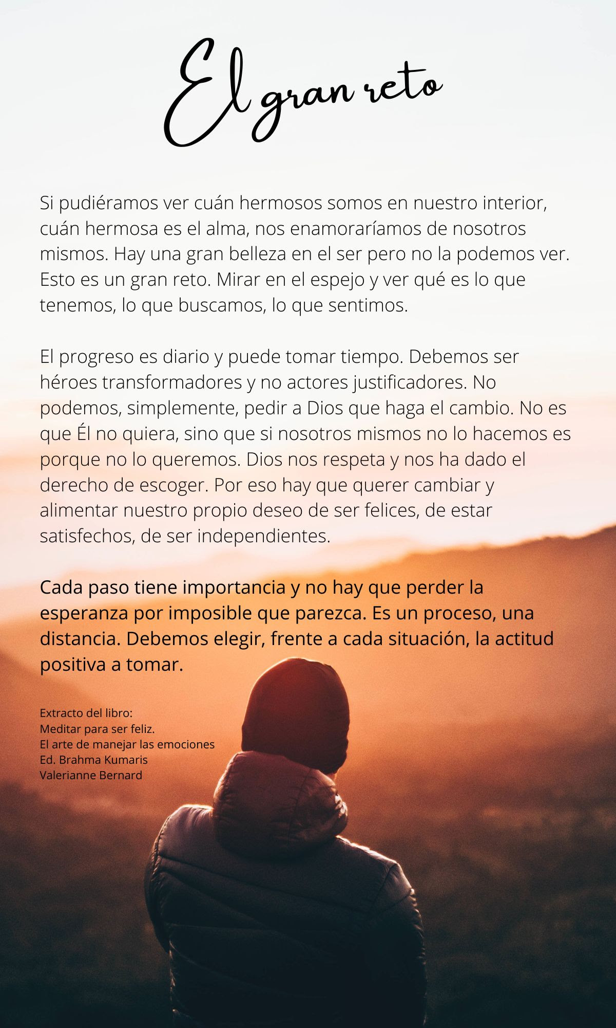 El progrés és diari i pot trigar temps. Hem de ser herois transformadors i no actors justificadors. No podem, simplement, demanar a Déu que faci el canvi. No és que Ell no ho vulgui, sinó que si nosaltres mateixos no ho fem és perquè no ho volem, Déu ens respecta i ens ha donat el dret d’escollir. Per això cal voler canviar i alimentar el nostre desig de ser feliços, d’estar satisfets, de ser independents.