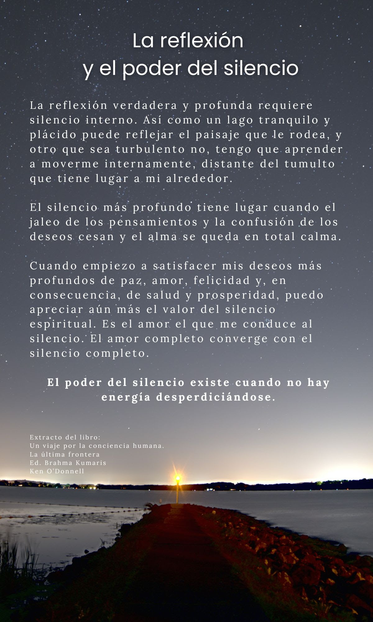 Quan començo a satisfer els meus desitjos més profunds de pau, amor, felicitat i, en conseqüència, de salut i prosperitat, puc apreciar encara més el valor del silenci espiritual. És l’amor el que em porta al silenci. L´amor complet convergeix amb el silenci complet.