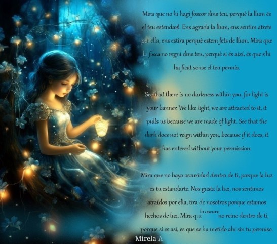 Mira que no hi hagi foscor dins teu, perquè la llum és el teu estendard. Ens agrada la llum, ens sentim atrets per ella, ens estira perquè estem fets de llum. Mira que la fosca no regni dins teu, perquè si és així, és que s’hi ha ficat sense el teu permís.