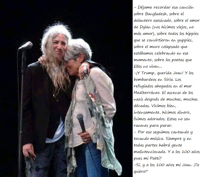 Patti Smith, 72 anys i Joan Baez 77 anys, fa uns dies a Alemanya. - Deixa'm plorar per tu, Patti. - Jo també estic plorant, Joan, no em veus? - Deixa'm recordar aquesta cançó sobre Bangla Desh, sobre el davanter assassinat, sobre l'amor de Dylan (ens vam fer vells, no més amor), sobre tots els hippies que es van convertir en yuppies, sobre el mur col·lapsat que estàvem celebrant en aquell moment, sobre els poetes que Ells no viuen... -I Trump, estimada Joan! I els bombardejos a Síria. Els refugiats ofegats al mar Mediterrani. L'ascens dels nazis després de moltes dècades. Vam viure bé, intensament, vam fer diners, vam ser adorats. Aquestes no són raons per aturar-se. - Per això seguim cantant i tocant música. Sempre i a tot arreu hi haurà gent malintencionada. I als 100 anys doncs.., la meva Patti? -Sí, i als 100 anys la meva Joan. T'estimo!" Patti Smith, 72 years old, and Joan Baez, 77 years old, a few days ago in Germany. - Let me cry for you, Patti. - I'm crying too, Joan, can't you see me? - Let me remember that song about Bangladesh, about the murdered striker, about Dylan's love (we became old, no more love), about all the hippies who became yuppies, about the collapsed wall that we were celebrating at that time, about the poets who do not live... -And Trump, dear Joan! And the bombings in Syria. Refugees drowned in the Mediterranean Sea. The rise of the Nazis after many, many decades. We lived well, intensely, we made money, we were adored. These are not reasons to stop. - That's why we continue singing and playing music. There will always and everywhere be malicious people. And at 100 years old, well..., my Patti? -Yes, and at 100 years old my Joan. I love you!" Patti Smith, 72 años y Joan Baez 77 años, hace unos días en Alemania. - Déjame llorar por ti, Patti. - Yo también estoy llorando, Joan, ¿no me ves? - Déjame recordar esa canción sobre Bangladesh, sobre el delantero asesinado, sobre el amor de Dylan (nos hicimos viejos, no más amor), sobre todos los hippies que se convirtieron en yuppies, sobre el muro colapsado que estábamos celebrando en ese momento, sobre los poetas que Ellos no viven... -¡Y Trump, querida Joan! Y los bombardeos en Siria. Los refugiados ahogados en el mar Mediterráneo. El ascenso de los nazis después de muchas, muchas décadas. Vivimos bien, intensamente, hicimos dinero, fuimos adorados. Estas no son razones para parar. - Por eso seguimos cantando y tocando música. Siempre y en todas partes habrá gente malintencionada. ¿Y a los 100 años pues.., mi Patti? -Sí, y a los 100 años mi Joan. ¡Te quiero!"