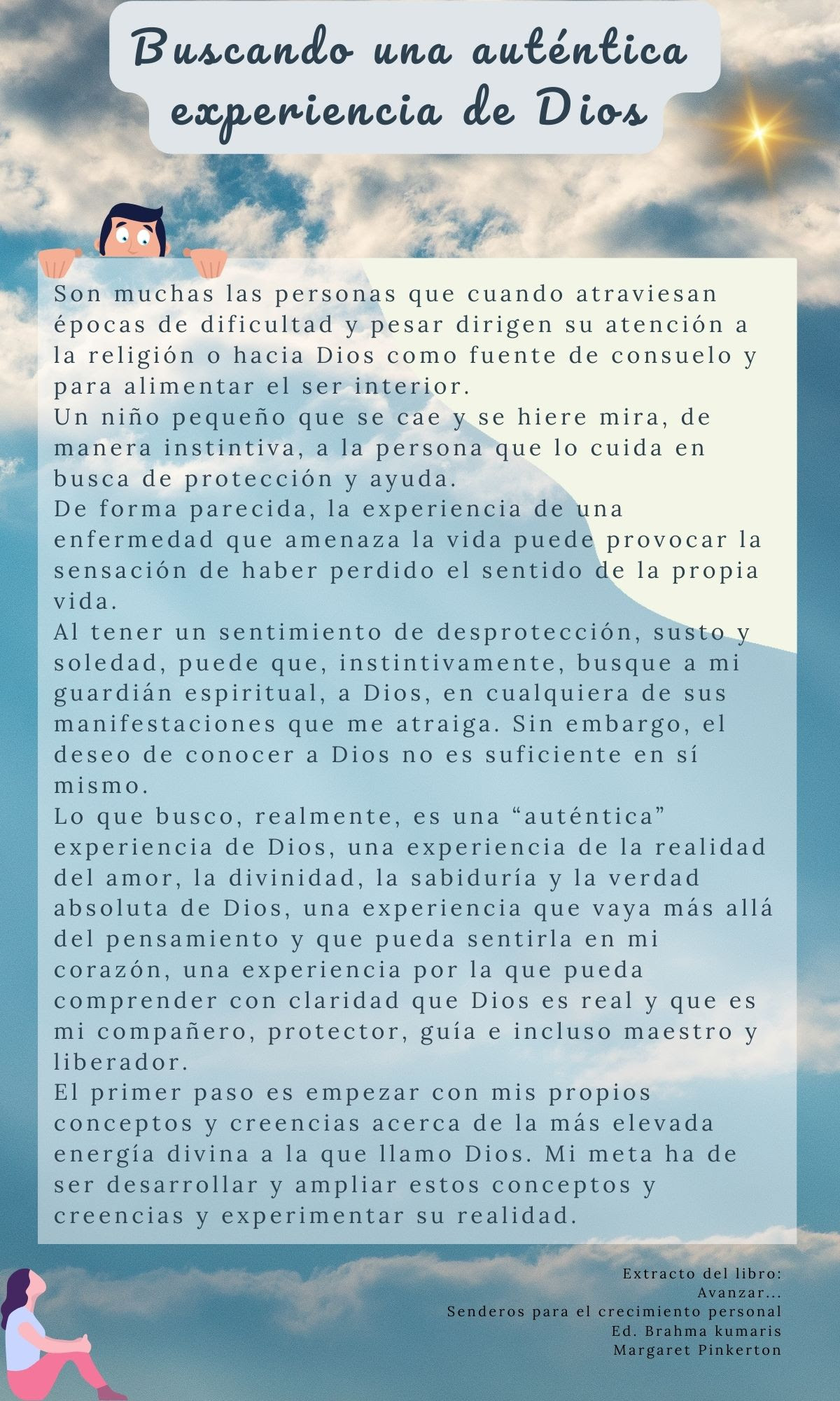 Lo que busco, realmente, es una “auténtica” experiencia de Dios, una experiencia de la realidad del amor, la divinidad, la sabiduría y la verdad absoluta de Dios, una experiencia que vaya más allá del pensamiento y que pueda sentirla en mi corazón, una experiencia por la que pueda comprender con claridad que Dios es real y que es mi compañero, protector, guia e incluso maestro y liberador.