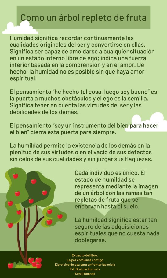 Cada individuo es único. El estado de humildad se representa mediante la imagen de un árbol con las ramas tan repletas de fruta que se encorvan hasta el suelo.