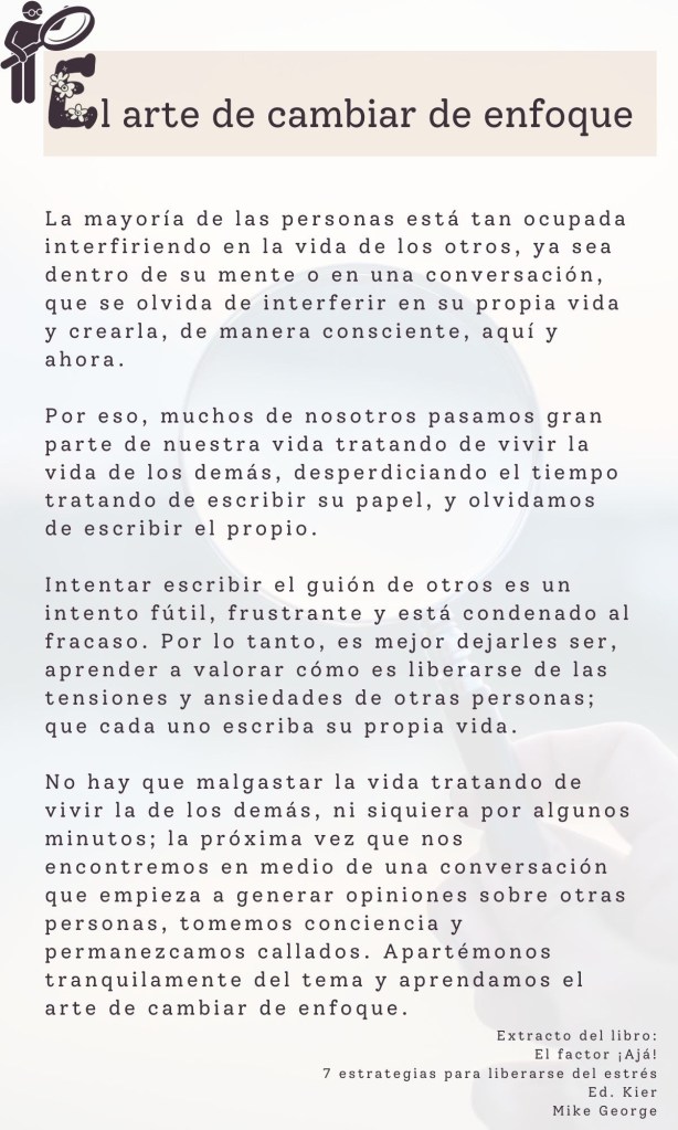 No hay que malgastar la vida tratando de vivir la de los demás, ni siquiera por algunos minutos; la próxima vez que nos encontremos en medio de una conversación que empieza a generar opiniones sobre otras personas, tomemos conciencia y permanezcamos callados. Apartémonos tranquilamente del tema y aprendamos el arte de cambiar de enfoque.