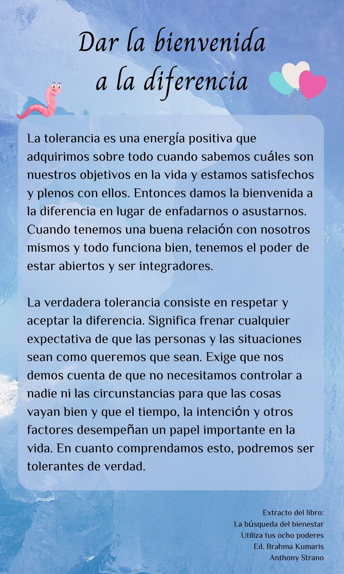 La tolerància és una energia positiva que adquirim sobretot quan sabem quins són els nostres objectius a la vida i estem satisfets i plens amb ells. Aleshores donem la benvinguda a la diferència en comptes d’enfadar-nos o d’espantar-nos. Quan tenim una bona relació amb nosaltres mateixos i tot funciona bé, tenim el poder d’estar oberts i ser integradors.