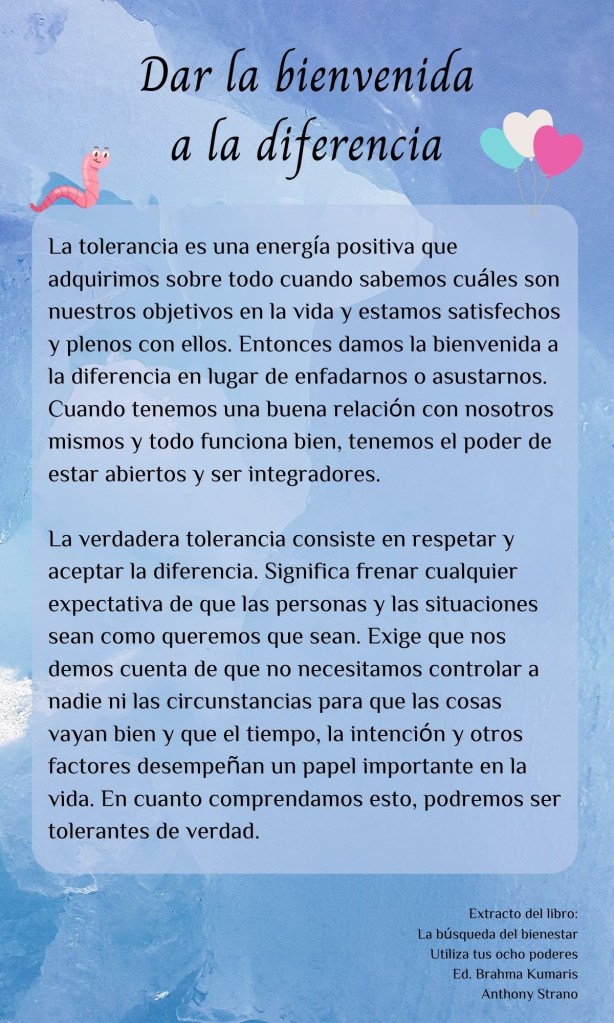 La tolerancia es una energía positiva que adquirimos sobre todo cuando sabemos cuáles son nuestros objetivos en la vida y estamos satisfechos y plenos con ellos. Entonces damos la bienvenida a la diferencia en lugar de enfadarnos o asustarnos. Cuando tenemos una buena relación con nosotros mismos y todo funciona bien, tenemos el poder de estar abiertos y ser integradores.