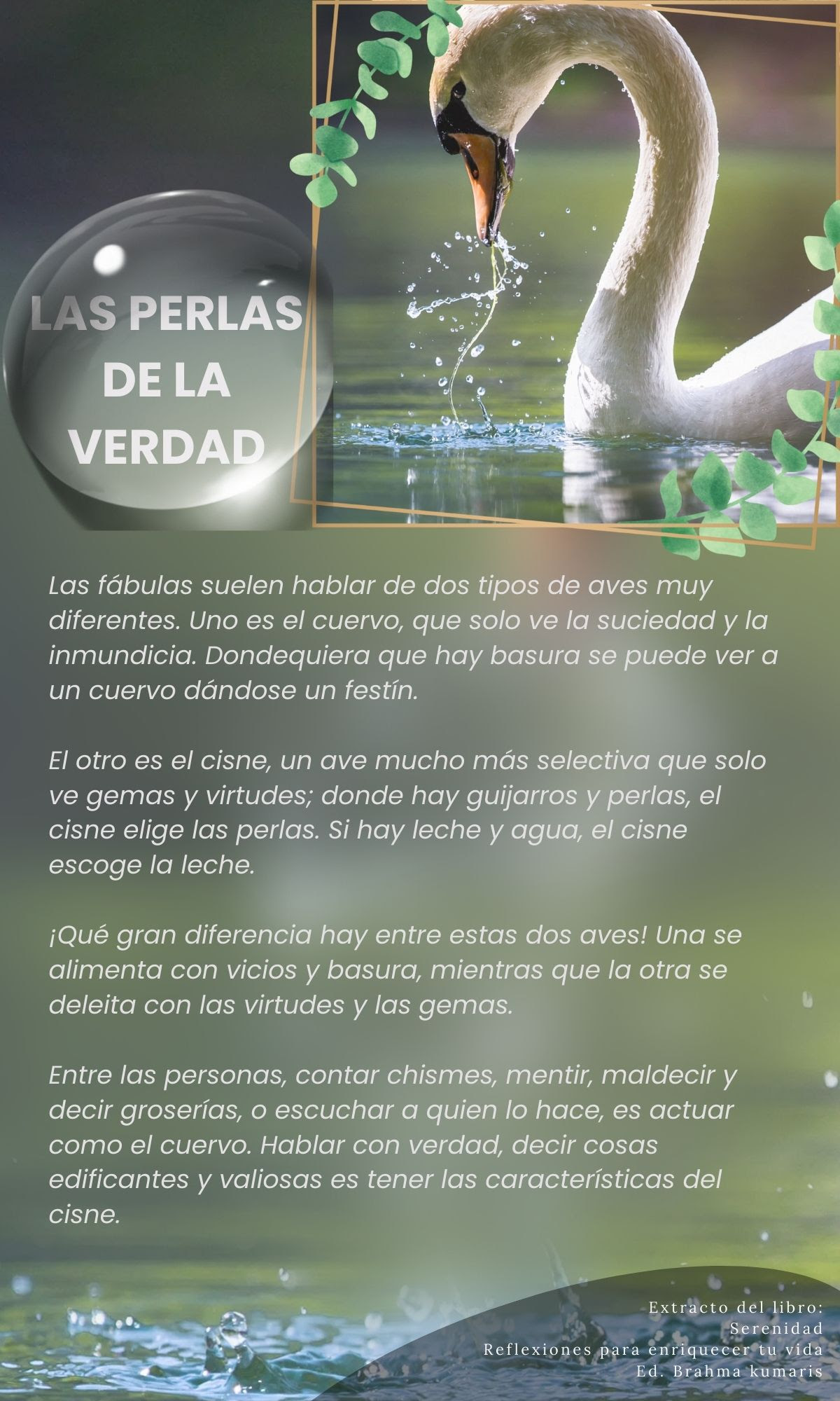 Entre las personas, contar chismes, mentir, maldecir y decir groserías, o escuchar a quien lo hace, es actuar como el cuervo. Hablar con verdad, decir cosas edificantes y valiosas es tener las características del cisne.