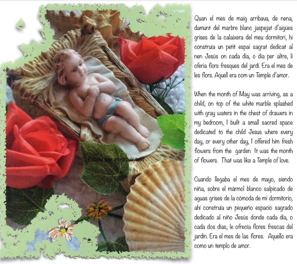 Quan el mes de maig arribava, de nena, damunt del marbre blanc “jaspejat” d’aigües grises de la calaixera del meu dormitori, hi construïa un petit espai sagrat dedicat al nen Jesús on cada dia, o dia per altre, li oferia flors fresques del jardí. Era el mes de les flors. Aquell era com un Temple d’amor.