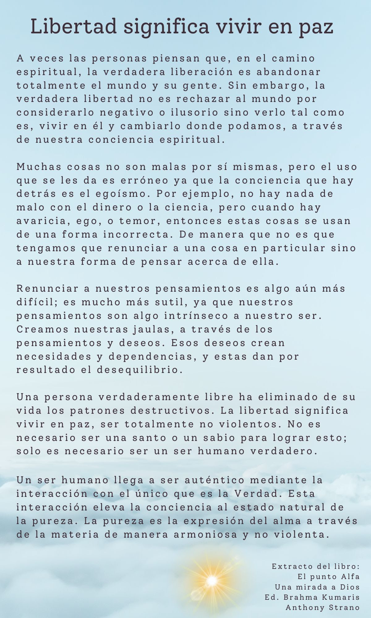 De vegades les persones pensen que, en el camí espiritual, el veritable alliberament és abandonar totalment el món i la seva gent. Tanmateix, la veritable llibertat no és rebutjar el món per considerar-lo negatiu o il·lusori, sinó veure’l tal com és, viure-hi i canviar-lo on puguem, a través de la nostra consciència espiritual.
