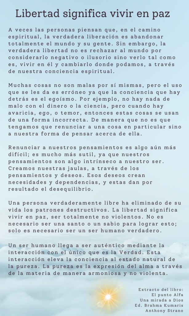 Una persona verdaderamente libre ha eliminado de su vida los patrones destructivos. La libertad significa vivir en paz, ser totalmente no violentos. No es necesario ser un santo o un sabio para lograr esto; solo es necesario ser un ser humano verdadero.