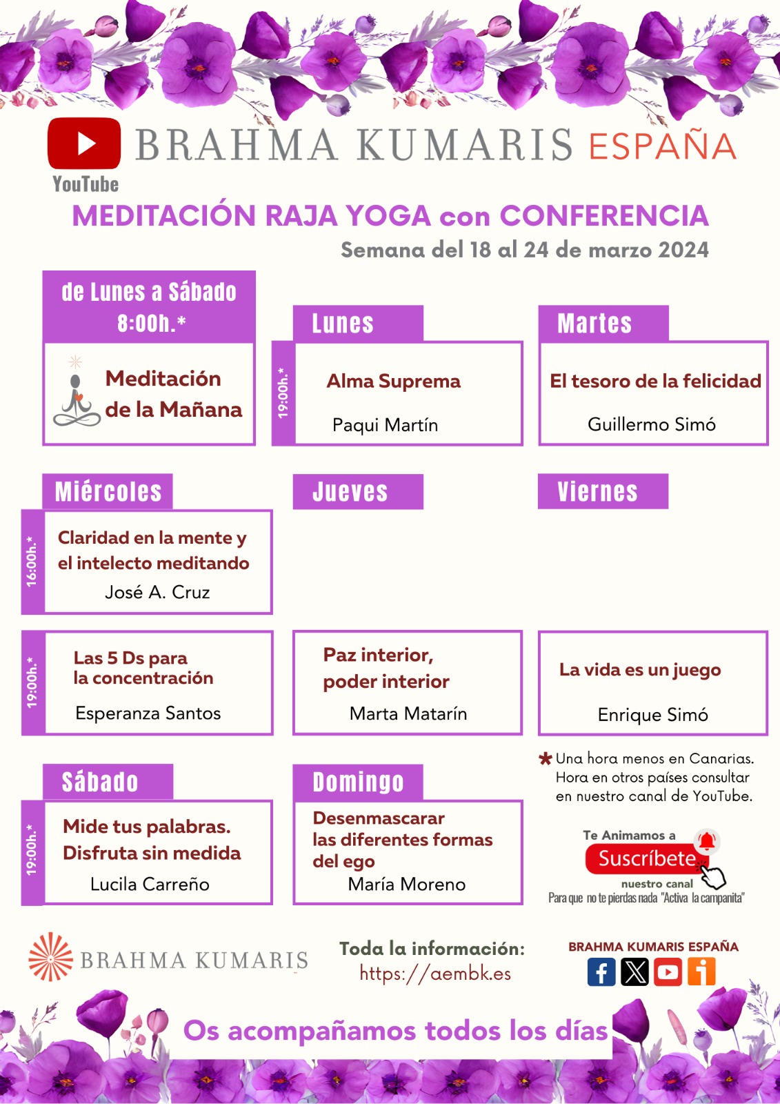 Del 18 al 24 de marzo del 2024, te invitamos a participar en nuestras “Meditaciones Raja Yoga con conferencia” desde el Canal de YouTube Brahma Kumaris España. Suscríbete y Activa la Campanita para que no te pierdas nada https://www.youtube.com/BrahmaKumarisEspaña Os acompañamos todos los días.