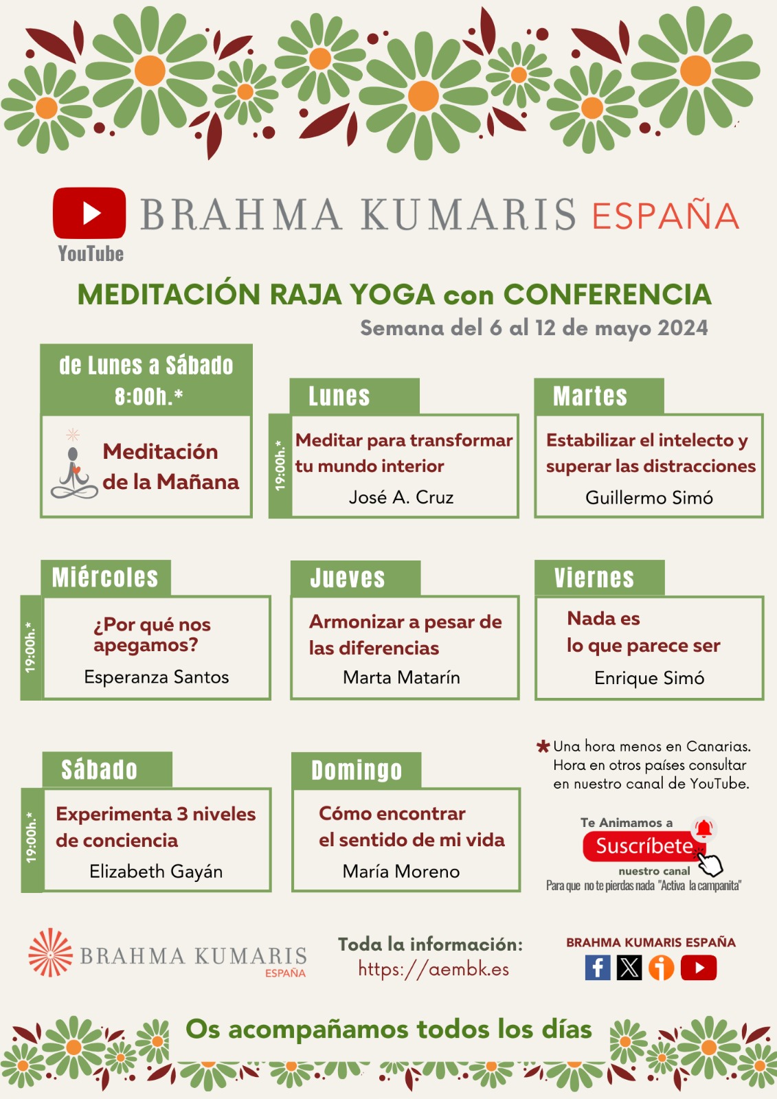 Del 6 al 12 de mayo del 2024, te invitamos a participar en nuestras “Meditaciones Raja Yoga con conferencia” desde el Canal de YouTube Brahma Kumaris España. Suscríbete y Activa la Campanita para que no te pierdas nada https://www.youtube.com/BrahmaKumarisEspaña Os acompañamos todos los días.