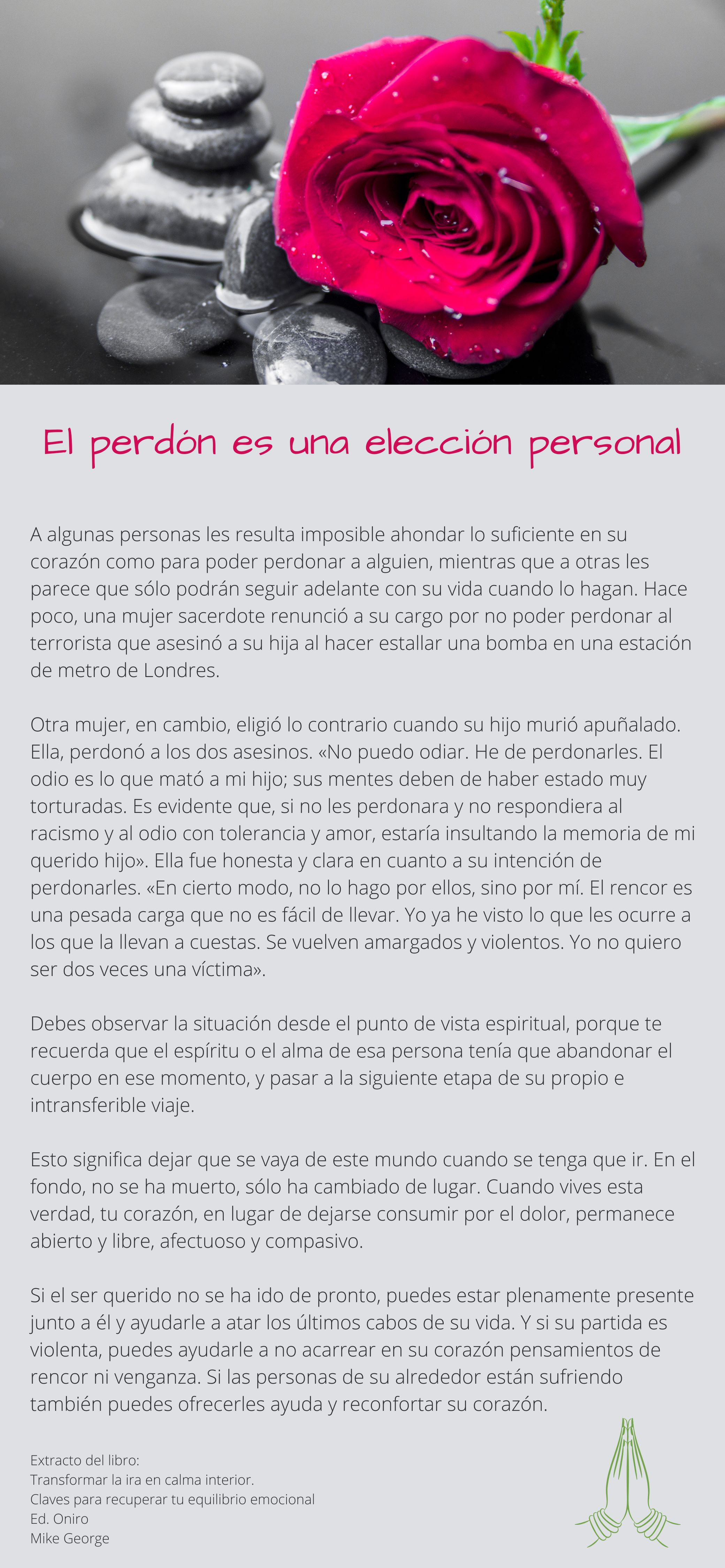 Otra mujer, en cambio, eligió lo contrario cuando su hijo murió apuñalado. Ella, perdonó a los dos asesinos. “No puedo odiar. He de perdonarles. El odio es lo que mató a mi hijo; sus mentes deben de haber estado muy torturadas. Es evidente que, si no les perdonara y no respondiera al racismo y al odio con tolerancia y amor, estaría insultando la memoria de mi querido hijo”. Ella fue honesta y clara en cuanto a su intención de perdonarles. “En cierto modo, no lo hago por ellos, sino por mí. El rencor es una pesada carga que no es fácil de llevar. Yo ya he visto lo que les ocurre a los que la llevan a cuestas. Se vuelven amargados y violentos. Yo no quiero ser dos veces una víctima”.
