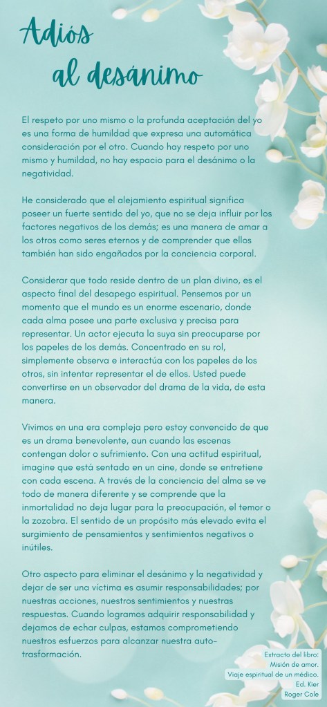 Vivim en una era complexa però estic convençut que és un drama benvolent, tot i que les escenes continguin dolor o patiment. Amb una actitud espiritual, imagineu que esteu asseguts en un cinema, on s’entretenen amb cada escena. A través de la consciència de l’ànima es veu tot de manera diferent i es comprèn que la immortalitat no deixa lloc per a la preocupació, el temor o l’angoixa. El sentit d’un propòsit més elevat evita el sorgiment de pensaments i sentiments negatius o inútils.