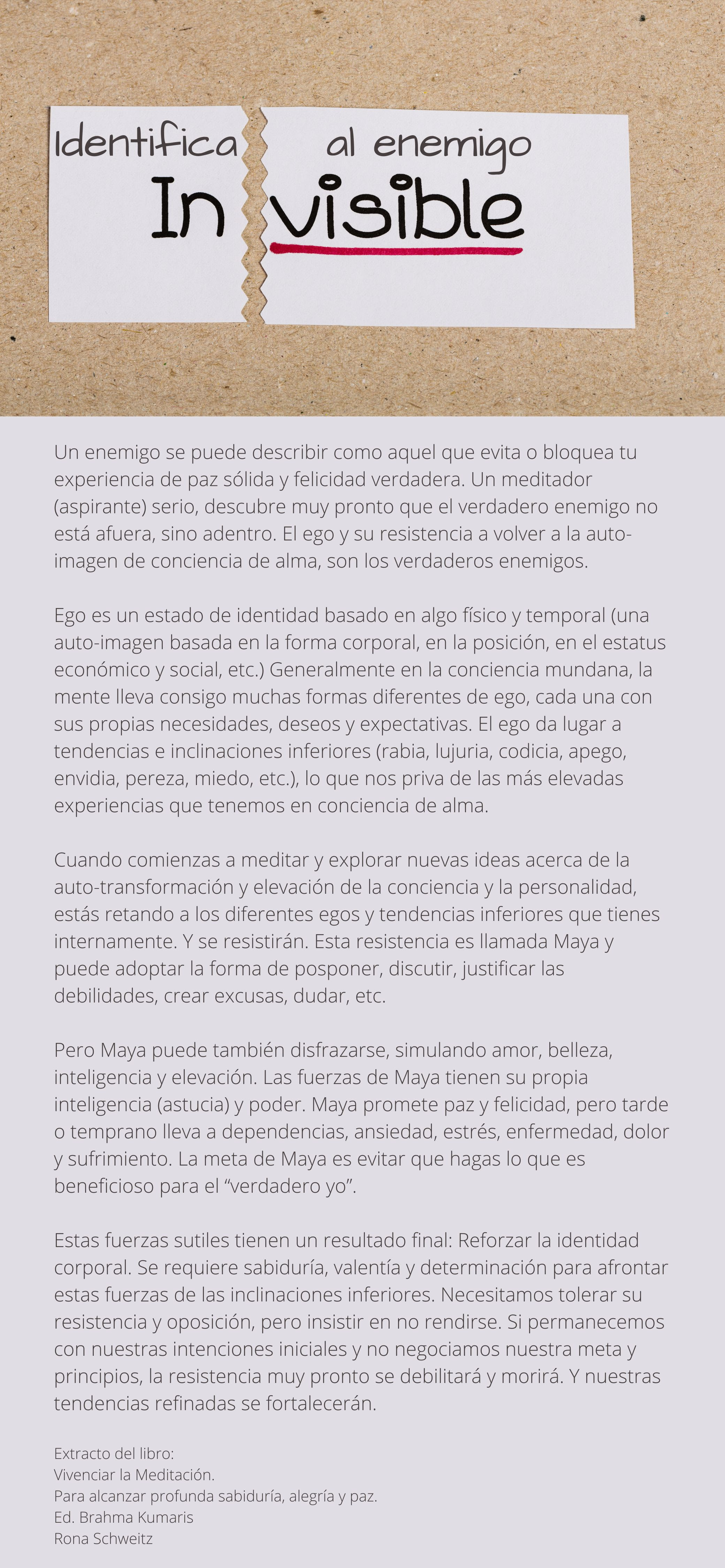 Un enemigo se puede describir como aquel que evita o bloquea tu experiencia de paz sólida y felicidad verdadera. Un meditador (aspirante) serio, descubre muy pronto que el verdadero enemigo no está afuera, sino adentro. El ego y su resistencia a volver a la auto-imagen de conciencia de alma, son los verdaderos enemigos.