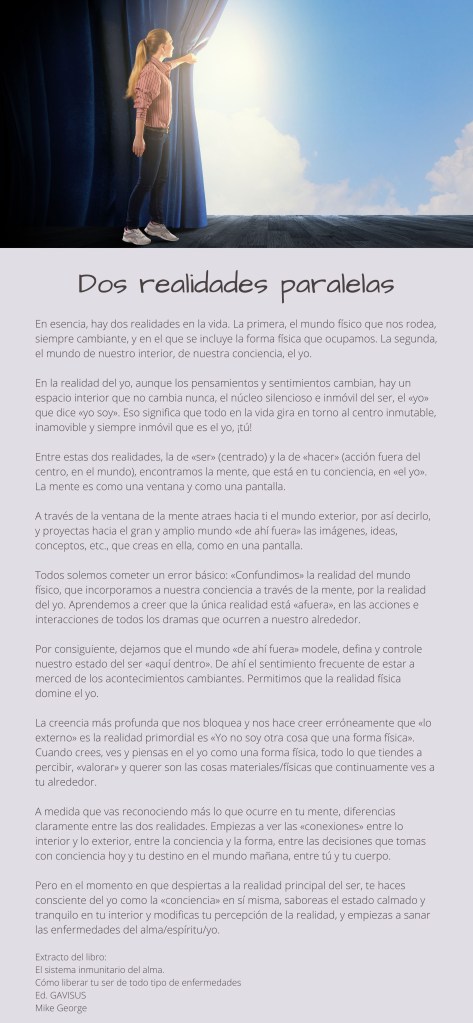 En essència, hi ha dues realitats a la vida. La primera, el món físic que ens envolta, sempre canviant, i en què s’inclou la forma física que ocupem. La segona, el món del nostre interior, de la nostra consciència, el jo.